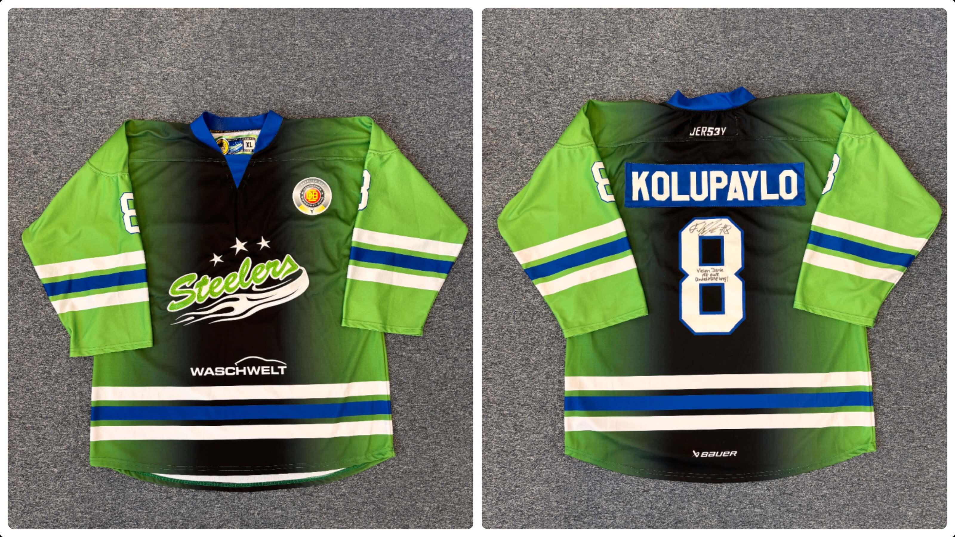 Versteigert wird das originale Warm-Up Trikot von Fedor Kolupaylo (Rückennummer 8) aus der Oberliga Meistersaison 2024/2025.