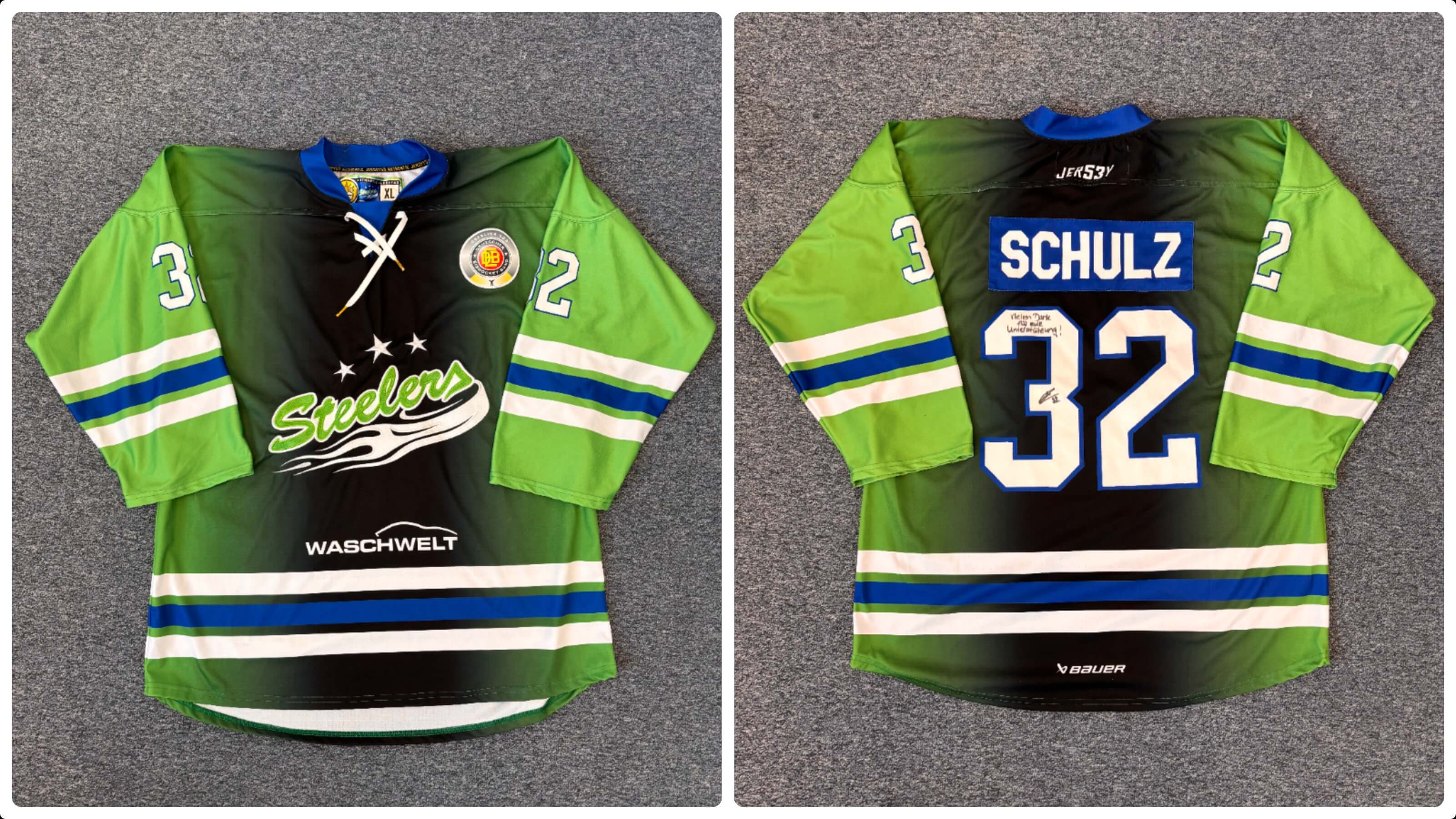 Versteigert wird das originale "Pucki-Trikot" mit der Rückennummer #1 was unser Stadionsprecher Pucki während der Oberliga-Saison 2024/2025 getragen hat. Auf der Rückseite sind die Unterschriften der gesamten Meistermannschaft.