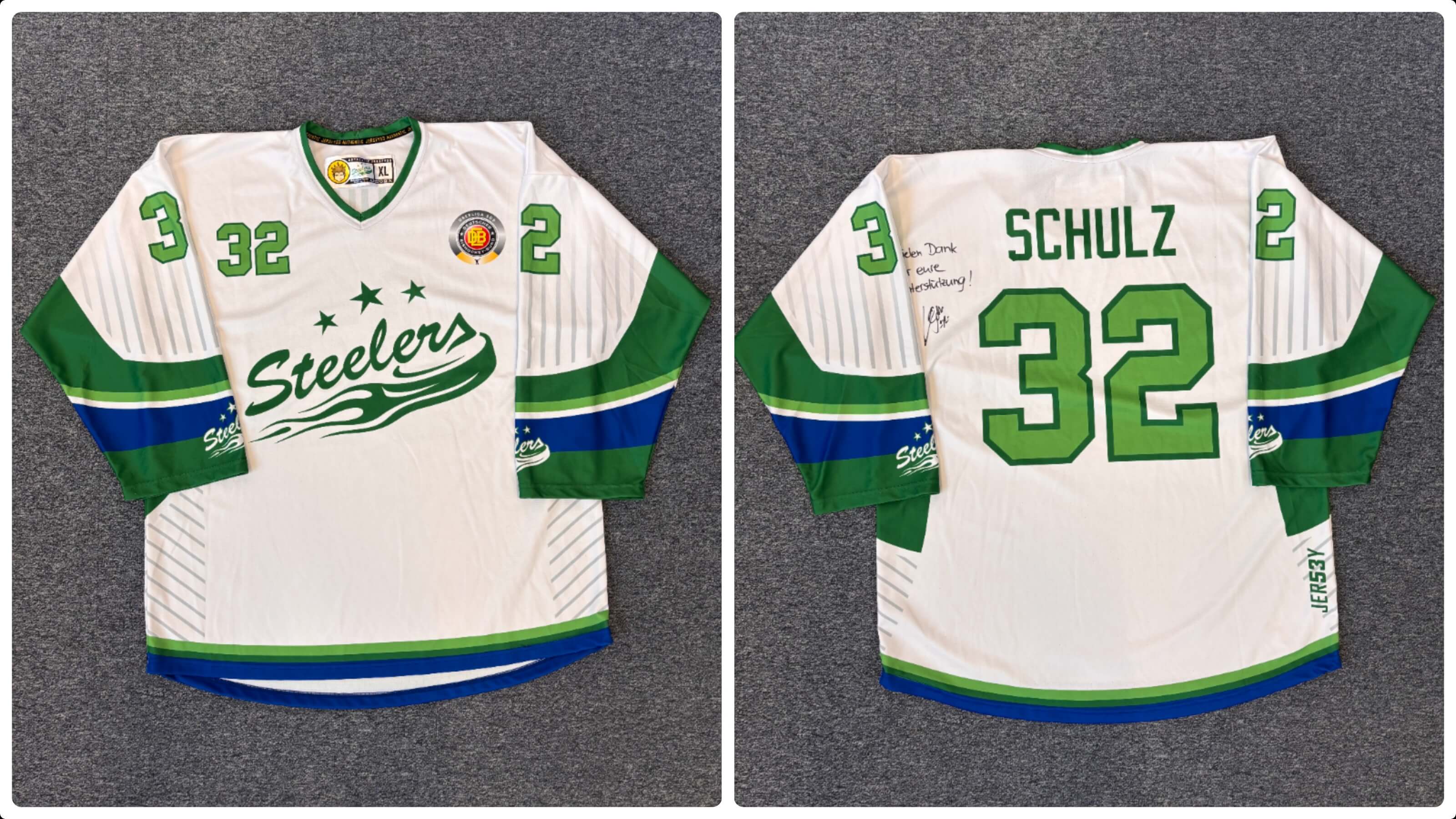 Das Trikot verfügt über ein großes geticktes Steelers Logo auf der Vorderseite. Zusätzlich sind das Oberliga-Süd Logo, die Rückennummer sowie der Spielername gestickt.