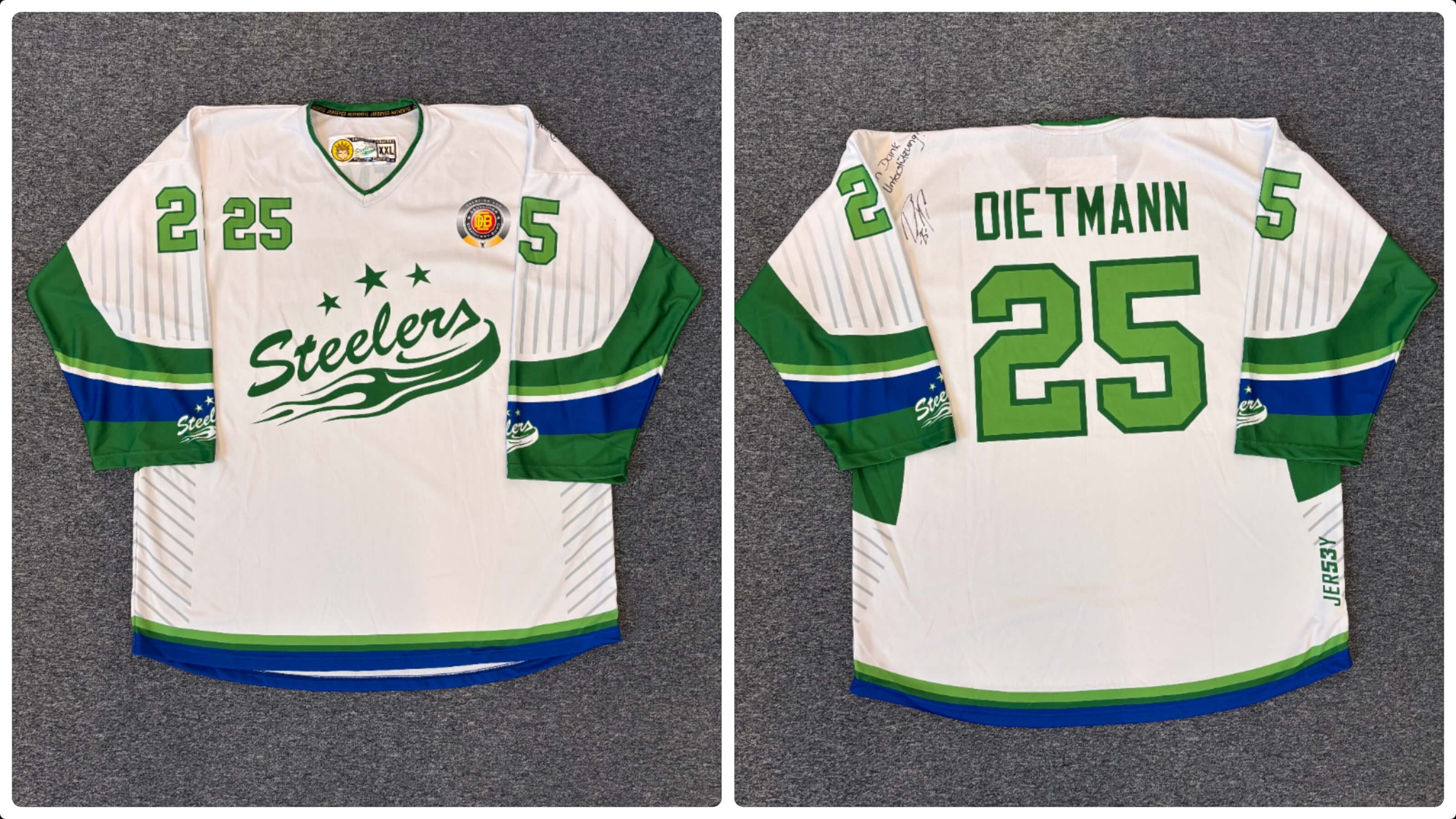 Versteigert wird das originale Warm-Up Trikot von Dennis Dietmann (Rückennummer 25) aus der Oberliga Meistersaison 2024/2025.