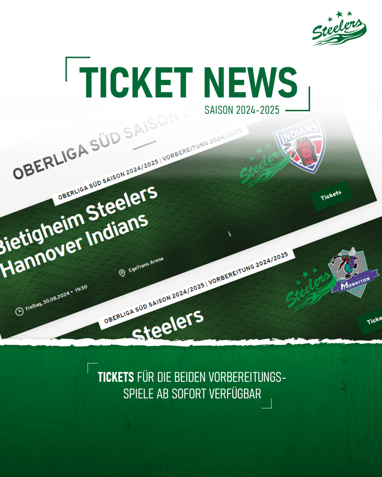 Ab sofort können sowohl über unseren Ticketing-Partner eventimsports als auch auf unserer Geschäftsstelle die Tickets für die beiden Vorbereitungsspiele in der EgeTrans Arena erwerben werden. Die Preise gegenüber der Hauptrunde sind wieder deutlich reduziert und alle Sitzplatz-Blöcke kosten bei diesen beiden Heimspielen einheitlich gleich viel. Somit möchten wir allen Steelers-Fans auch mal die Möglichkeit geben, ein Spiel von den „teuersten“ Sitzplätzen zu verfolgen.